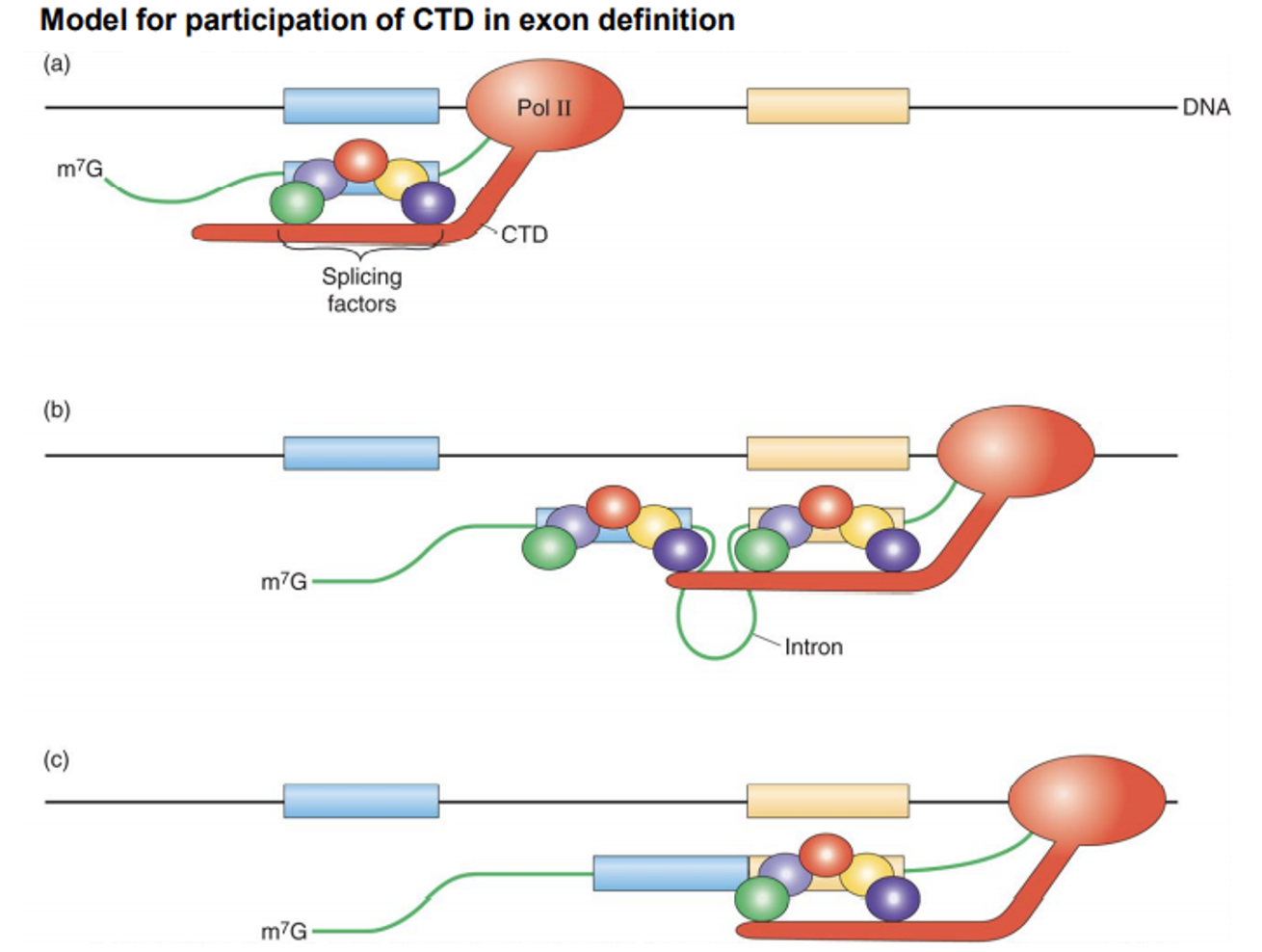 맨 오른쪽 결과에 주목하자. 이 경우 exon definition이 일어나지 못하도록 exon 끝부분(붉은색)을 잘라버림. 그 결과 CTD가 그다지 splicing을 촉진시키지 못함. 이를 통해 exon definition이 잘 일어나는 상황에서만 CTD가 splicing factor들을 recruit할 수 있다는 것을 알 수 있음.