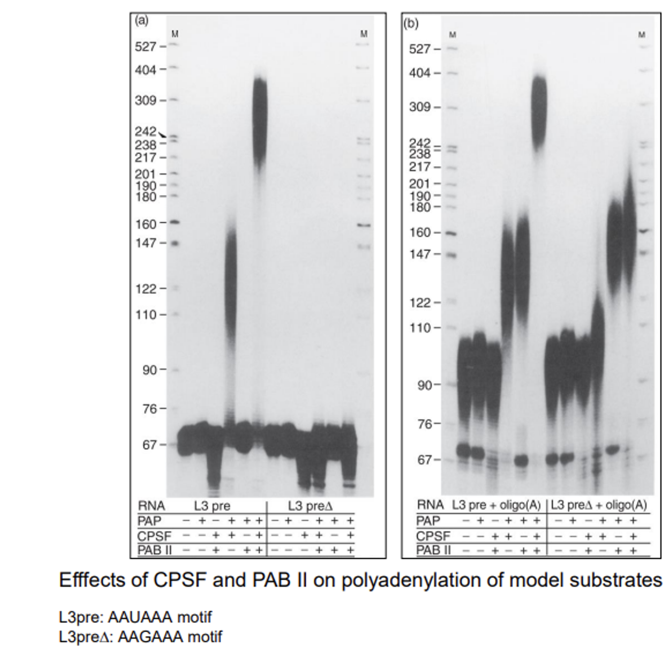 다음으로 L3 pre Δ를 살펴보자. 이 경우에는 우선 PAP와 CPSF만 넣어준 경우 추가적인 polyadenylation이 일어나지 않는데, 이는 당연한 것이 CPSF가 비정상적인 AAGAAA signal을 인지하지 못하기 때문. 한편 PAP, PAB II를 넣어준 경우, PAP, CPSF, PAP II를 넣어준 경우에는 추가적으로 polyadenylation이 일어남.