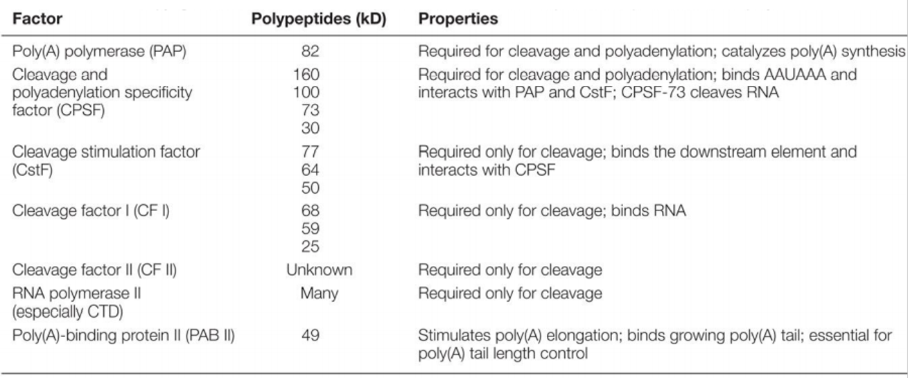 위 표에는 3' cleavage, polyadenylation과 관련된 다양한 factor들이 정리되어 있으므로 참고할 것.