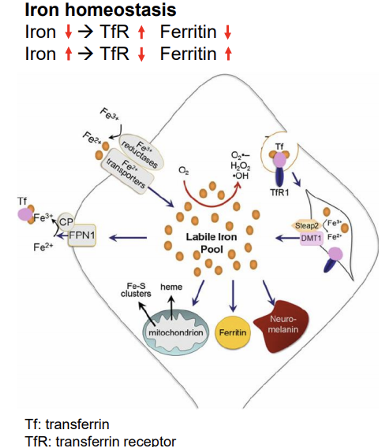 iron(철)은 세포 내에 너무 많을 시 toxic한 반면 그럼에도 불구하고 세포 내에 어느 정도의 양은 있어야 하기에 iron 농도가 정교하게 조절되어야 함. 이와 관련된 단백질이 transferrin receptor(TfR)와 ferritin임.