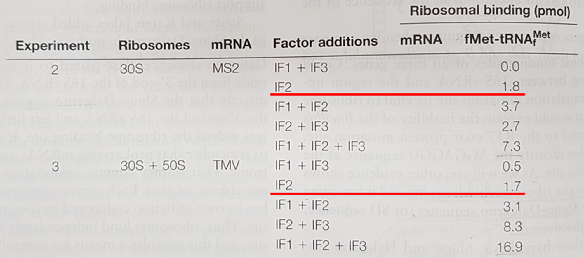 앞서의 unclear한 부분을 조금 더 명확히 하기 위해 이번에는 다른 system으로부터 유래한 mRNA를 가지고 동일한 실험을 수행함. 그 결과 IF2만 넣어줬을 때 갑자기 fMet-tRNA와 ribosome 간 결합력이 확 증가하는 것을 볼 수 있음. 이를 통해 IF2가 fMet-tRNA와 ribosome 간의 binding에 있어 핵심적으로 작용하는 key binding factor라는 것을 알 수 있음. (이 경우에도 앞서와 마찬가지로 IF1, 3는 IF2의 역할을 보조해준다는 것을 알 수 있음)