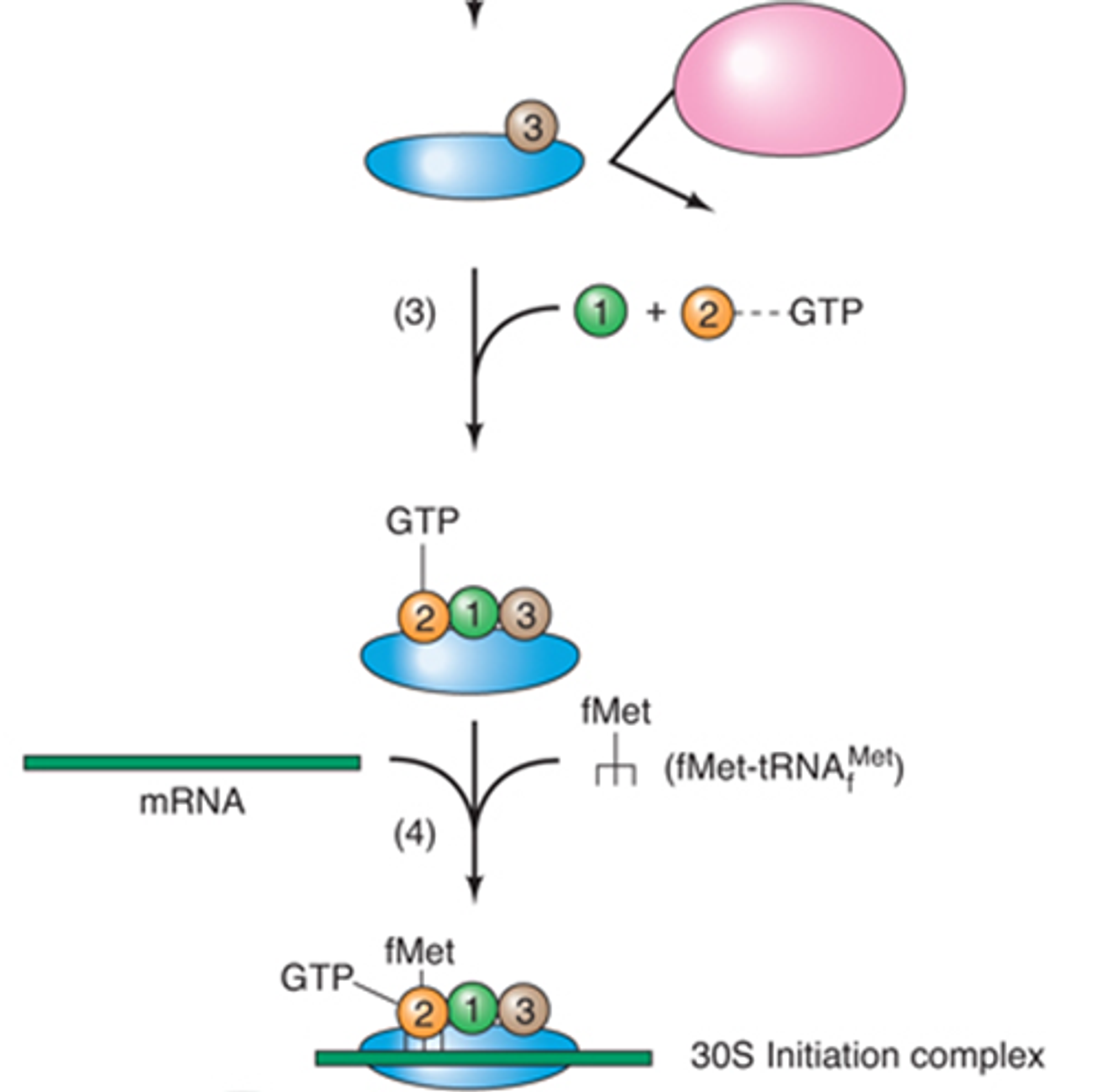 결국 이런 일련의 연구를 거쳐서 위와 같은 sequential한 과정이 밝혀졌음. 이 때 중요한 것은 30S initiation complex를 형성할 때 각종 factor, element들이 sequential하게 들어온다는 것임. 그 밖에 IF1, 2, 3가 모두 하나씩 모여서 30S initiation complex를 형성한다는 것도 기억해둘 것. (이런 개수와 관련된 정보는 stoichiometry를 측정해 알아냄)