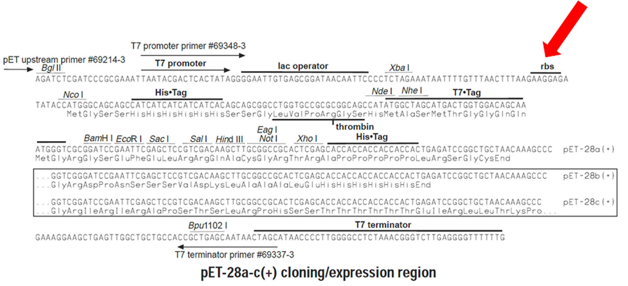 Shine-Dalgarno sequence를 이용하면 위와 같이 expression vector를 만들 수도 있음. 위 그림은 expression plasmid의 한 종류를 나타내 주고 있으며 빨간색 화살표로 표시된 부분에 ribosomal binding site(Shine-Dalgarno sequence)가 들어가 있음을 확인 가능함. 이 site가 존재하게 되면 결국 이 site로부터 대략 10nt 안에 존재하는 AUG부터 쭉 단백질로 번역될 것임. (위 그림에도 실제로 rbs sequence보다 조금 아래에 ATG로 표시되어 있는 부분이 있음을 알 수 있음) 참고로 이런 expression vector를 사용해주면 bacteria에서 특정한 protein을 overexpression시킬 수 있으므로 이런 vector를 다양한 분야에서 활용 가능함.