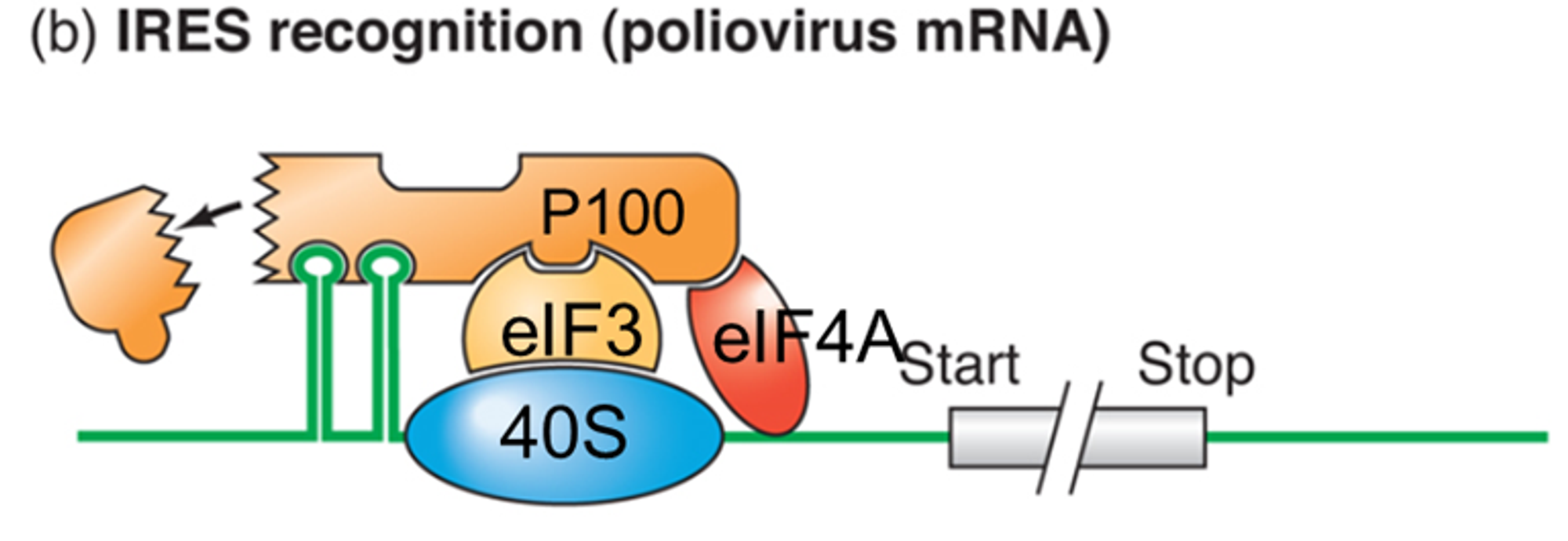 poliovirus는 viral protease를 생산하는데, 이 viral protease는 위 그림상에도 나타나 있는 것처럼 eIF4G의 N-terminal domain을 잘라버림. 그렇게 되면 원래는 이 녀석과 함께 붙어야 할 eIF4E도 recruit되지 않을 것임. (즉, capping이 굳이 인식되지 않아도 complex가 형성될 것임) 이와 동시에 poliovirus는 mRNA 내에 internal ribosome entry sequence(IRES)라는 것을 가지고 있고, 이 서열이 (잘려나가고 남은) eIF4G에 의해 위 그림과 같이 인식될 수 있게 됨. 그 결과 정상적인 circular mRNA가 형성되고 translation이 잘 일어나게 됨.