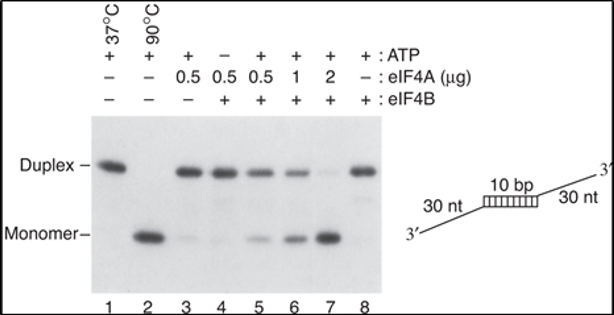 이 실험에 사용한 것은 위 그림 오른쪽에 나온 40nt 길이의 nucleotide임. 보면 이 녀석들을 넣어줄 시 10bp 길이의 nucleotide 부분에 대해 상보적인 결합이 형성되면서 duplex가 형성됨. (각각의 sequence 5' 말단에는 radioactive한 인산기가 달려있음) 이러한 상황에서 eIF4A에 의한 helicase activity에 의해 이 duplex가 풀어져 monomer가 생성되는지 여부를 확인하기 위해 위 그림 왼쪽과 같은 gel mobility shift assay를 수행함.
