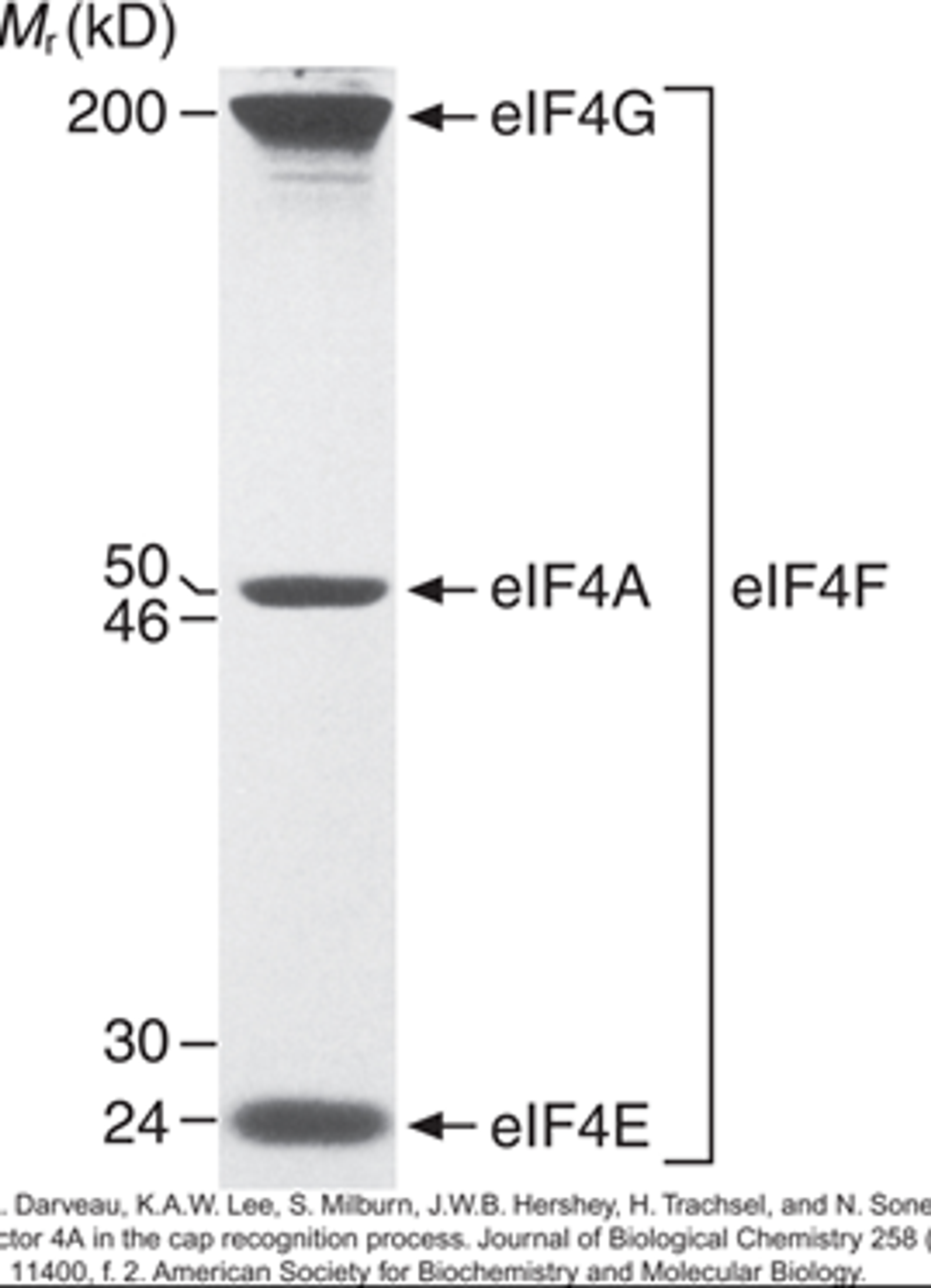 eIF4는 위 실험 결과에 나타나 있는 것처럼 3가지 polypeptide들로 이루어져 있음. 각각 eIF4E(25kD), eIF4A(50kD), eIF4G(220kD)이며 저마다의 역할이 존재함.