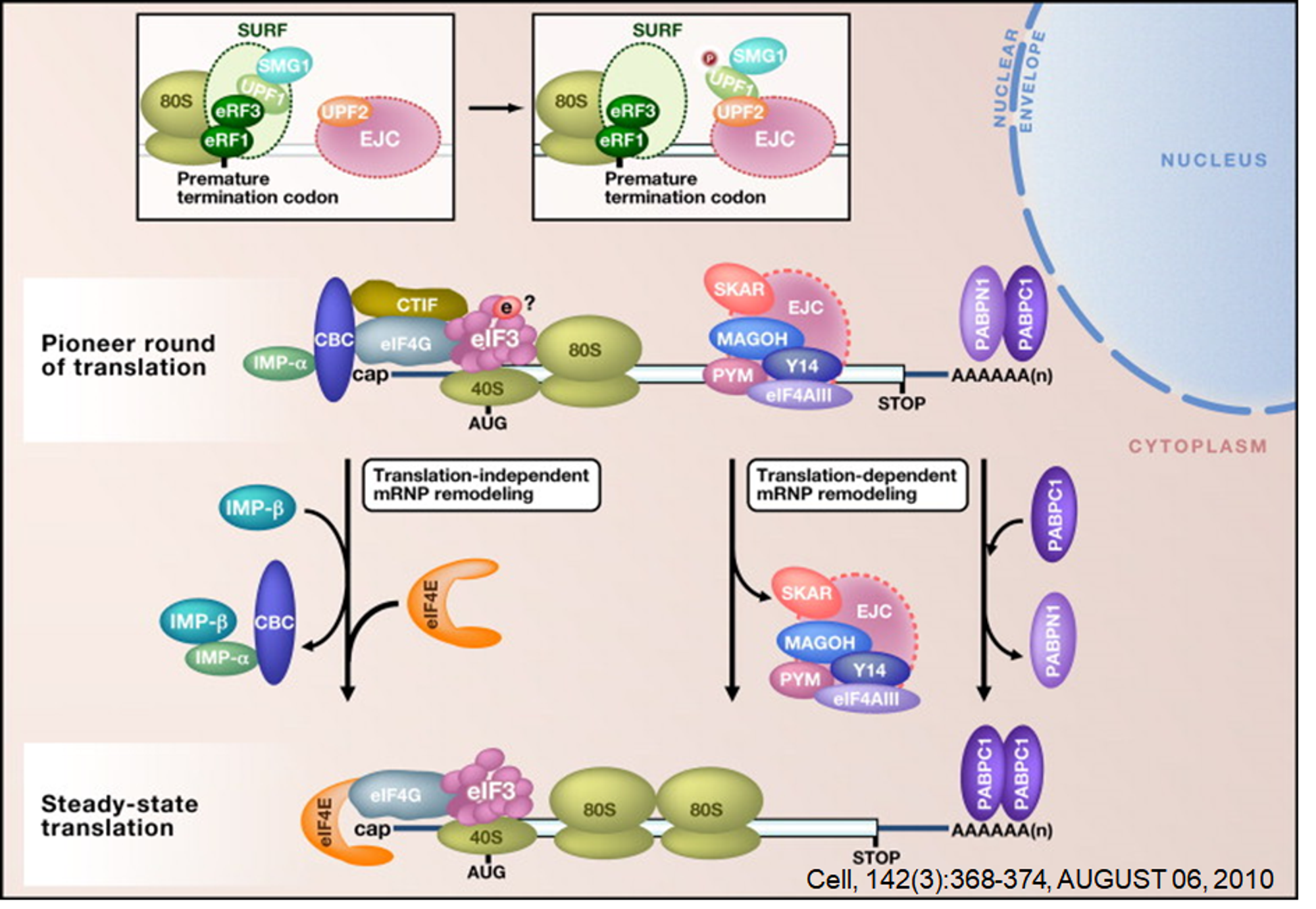 위 그림을 보면 처음에는 CBC가 5' cap에 붙어있으면서 ribosome complex를 불러모은 뒤 시범삼아 translation을 한번 시켜봄. 이 때 단백질이 잘 만들어지고, 끝까지 만들어진다는 confirm이 이루어지고 나면 CBC는 떨어지고 eIF4E가 5' cap에 붙으면서 앞서 살펴봤었던 complex를 형성해 결과적으로 반복적인 translation이 일어나게 됨.