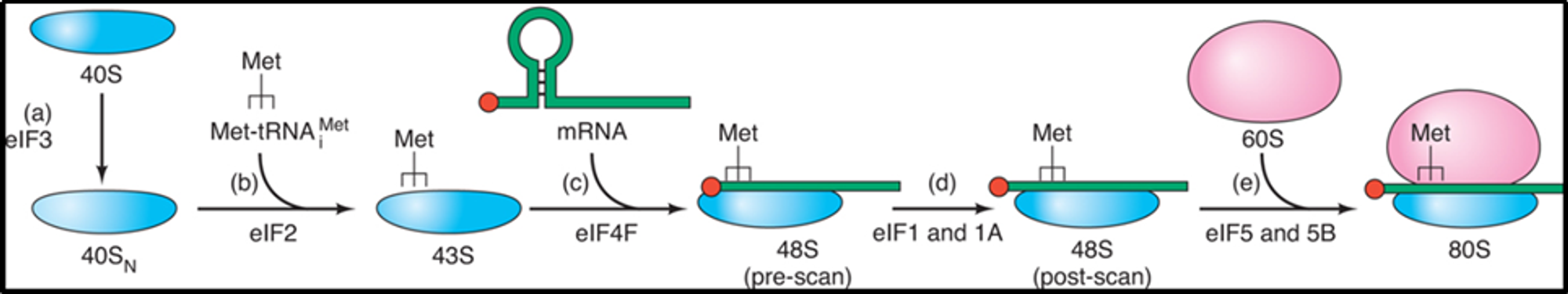 우선 eIF3는 40S ribosomal subunit에 붙어 60S subunit과의 reassociation을 막아주고, 동시에 eIF6는 60S subunit에 붙어 40S subunit과의 reassociation을 막아줌. 한편 GTP가 붙은 상태의 eIF2는 Met-tRNA를 ribosome으로 데려오는 역할을 함. 이후 eIF2의 GTP가 hydrolysis되고 나면 eIF2는 40S subunit으로부터 release됨. 이 때 가수분해에 의해 생성된 GDP에는 (GEF[guanine nucleotide exchange factors]의 일종인) eIF2B가 작용해 이 녀석을 GTP로 다시 바꿔주게 됨. 이 상태에서 eIF4는 cap-binding protein으로 작용해 40S subunit이 mRNA의 5' end에 붙을 수 있도록 도와줌. 이후 eIF1과 eIF1A가 ribosome의 scanning을 도와주게 됨. 마지막으로 eIF5는 favorable한 initiation site 부근에서 48S complex와 60S ribosome subunit 간의 association을 매개해줌. 이런 과정을 거쳐 eukaryotic translation initiation이 이루어짐.