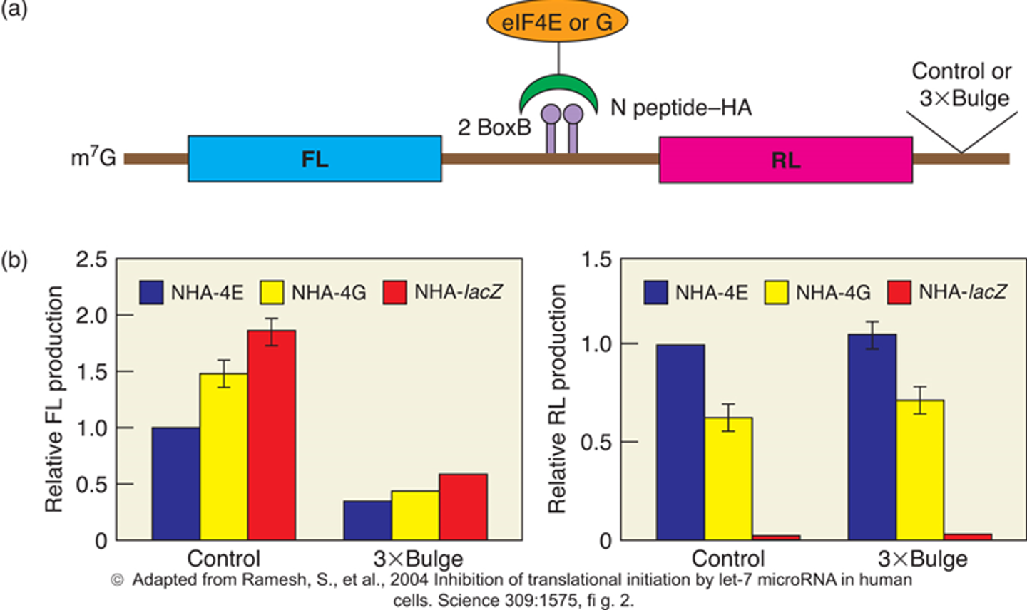 miRNA가 mRNA와 tight하게 붙을 경우에는 mRNA의 직접적인 degradation이 유발됨. 그러나 miRNA와 mRNA가 imperfect하게 붙으면 translation initiation이 억제됨. 이와 관련된 대표적인 예시를 살펴보자.