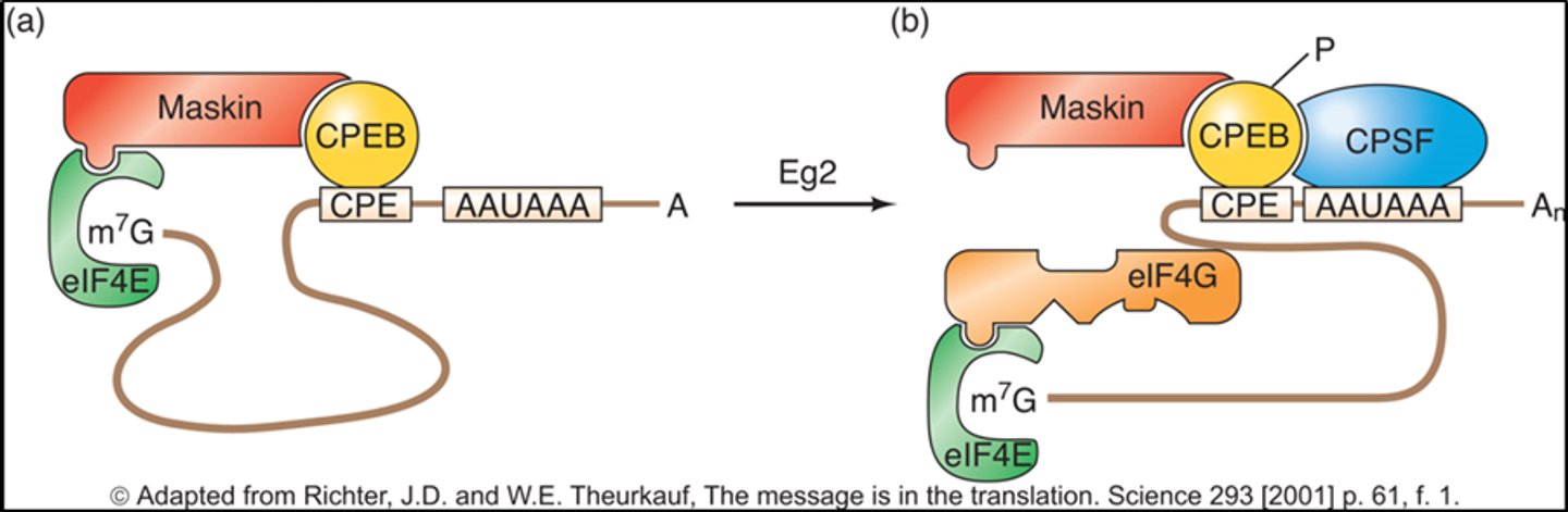 그러다가 Eg2에 의해 (b)와 같이 CREB에 인산화가 일어나게 되면 이제 Maskin이 eIF4E로부터 분리되어 나오게 되고, polyadenylation도 촉진되게 됨. 그리고 자유로워진 eIF4E에 eIF4G가 결합하면서 결과적으로 active한 translation initiation complex가 형성되게 됨.