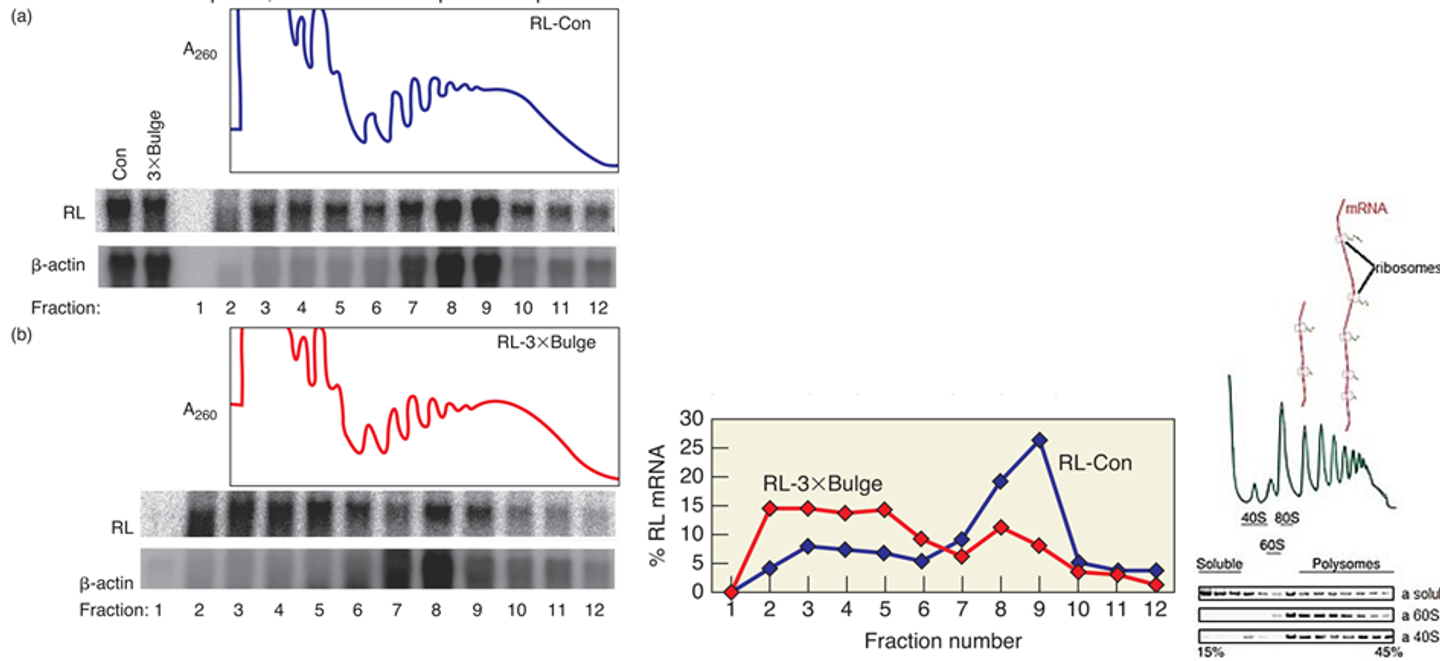 위 그림에서 (a)의 RL data는 Rluc-con의 결과이고, (b)의 Rluc data는 RL-3XBulge의 결과임. 또한 fraction number가 작을수록 가벼운(즉, ribosome 없이 mRNA 그 자체로만 존재하는 녀석들) 녀석들이고 fraction number가 클수록 무거운(즉, ribosome과 mRNA가 하나 혹은 그 이상[polysome] 결합해 있는) 녀석들임. (이와 관련된 그림이 위 그림 맨 오른쪽에 나타나 있음)