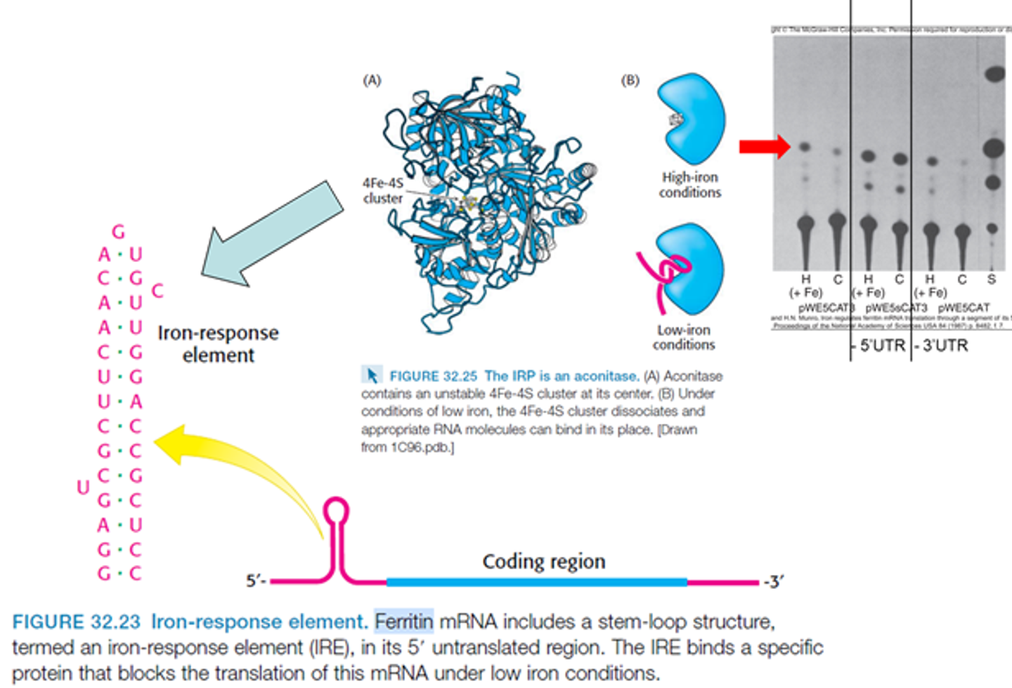 위 그림 아래에 나와있는 mRNA가 바로 Ferritin mRNA임. 보면 5' UTR 부근에 iron response element(IRE)라 불리는 RNA hairpin이 형성되어 있음. 철이 없는 조건이라면 이 IRE에 repressor protein인 aconitase apoprotein이 결합할 수 있는데, 그러면 결과적으로 translation이 shutdown되어 ferritin이 거의 발현되지 않음. 한편 철이 있는 조건이라면 aconitase apoprotein에 철이 결합하고, 이 때문에 aconitase apoprotein의 구조가 변해서 IRE에 이 녀석이 결합하지 못하게 됨. 그 결과 ferritin이 정상적으로 많이 합성되게 됨.