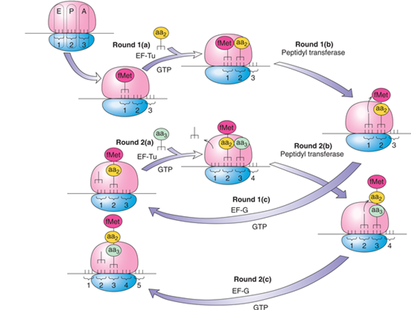 전체적인 elongation cycle 모식도는 위와 같음. elongation cycle은 크게 3개의 step으로 나누어지는데, 아래와 같음.