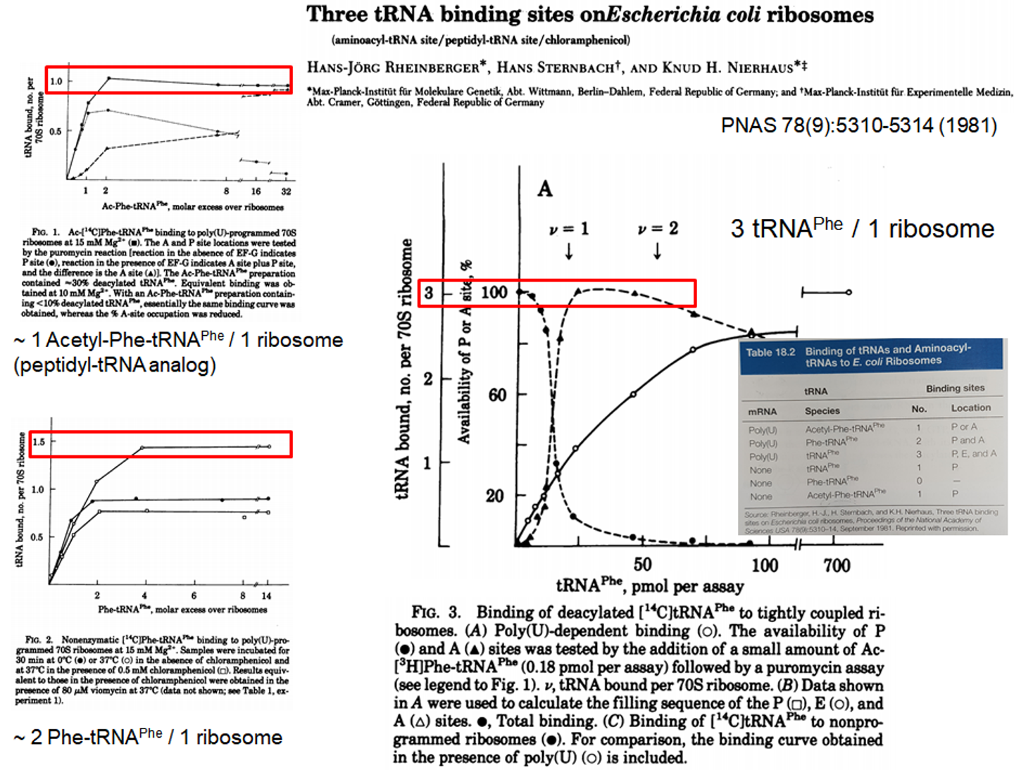 마지막으로 poly U mRNA와 함께 그냥 tRNA(Phe를 충전할 수 있는 녀석)를 넣어준 경우를 살펴보자. 이 때의 stoichiometry를 확인해 본 결과가 위 그림 오른쪽에 나타나 있으며, 결과적으로 ribosome 1개당 3개의 tRNA가 결합한다는 것을 알게 됨. 이러한 결과가 나온 이유는 그냥 tRNA가 E site, P site, A site에 동시에 결합할 수 있기 때문임.