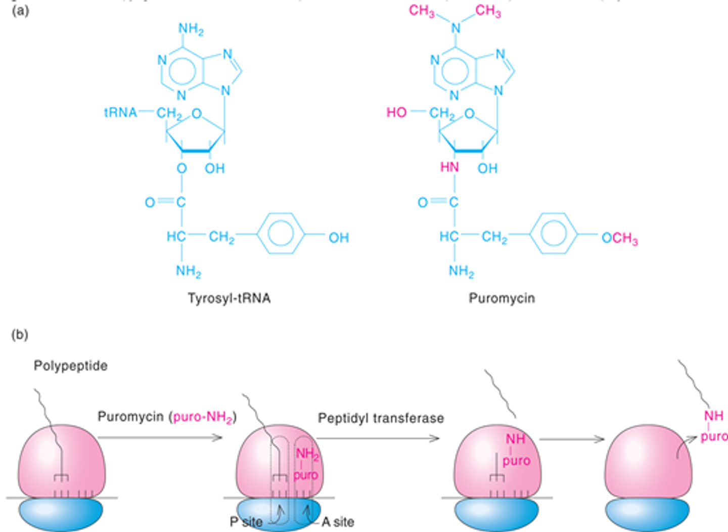 위 그림 (a)의 오른쪽 구조가 puromycin임. 보면 puromycin이 위 그림 왼쪽에 나타난 것과 같은 tyrosyl-tRNA와 매우 유사하다는 것을 알 수 있음. (참고로 이 때 tyrosyl-tRNA의 위쪽에 나타난 구조는 tRNA의 말단부인 A 구조임)