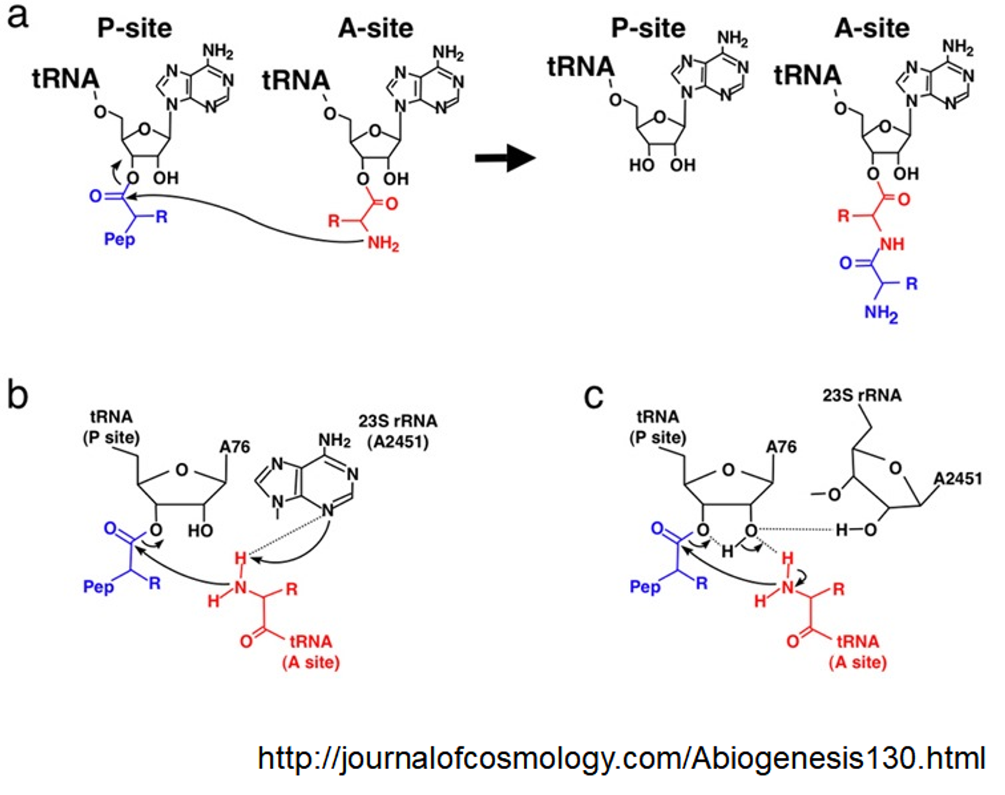 이런 식의 반응 mechanism을 가지고 있기 때문에 실제로 23s rRNA의 2451번 A의 2' 부위를 그냥 H로 바꿔버리게 되면 ribosome에서의 peptidyl transferase 활성이 관찰되지 않음.