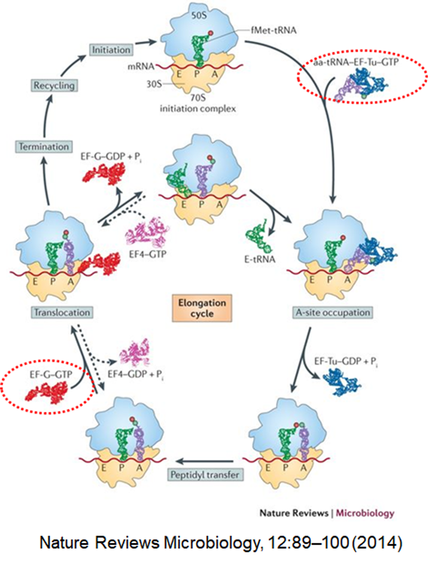 위 그림은 translation elongation cycle에서 어떤 protein factor들이 작용하는지를 나타내주고 있음. 이 때 중점적으로 살펴봐야 할 factor들은 크게 EF-T와 EG-G이며 뒤이어 이들 factor들의 역할에 대해 자세히 알아볼 것임.