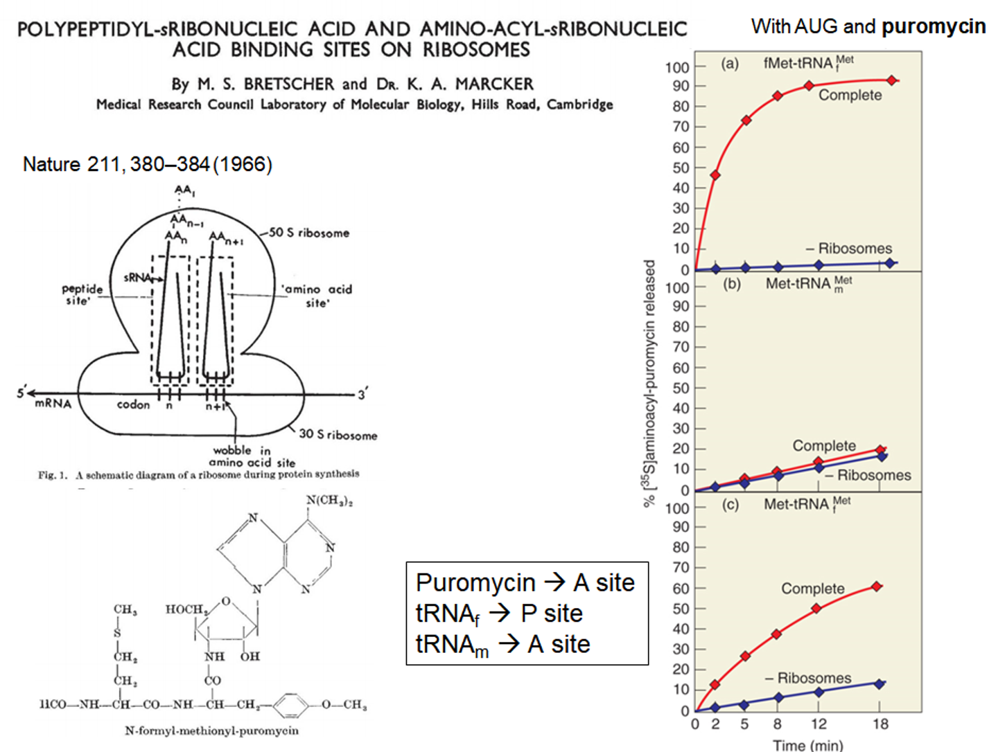 이 실험결과를 통해 결국 ribosome 중 puromycin이 결합하는 자리와 initiator tRNA가 결합하는 자리는 서로 다르다는 것을 알 수 있으며, 한편 initiator tRNA와 그냥 tRNA가 결합하는 자리 또한 다르다는 것을 알 수 있음. (특히 (b) 결과를 통해 puromycin과 그냥 tRNA가 결합하는 자리가 동일하다는 것도 추측할 수 있음) 실제로는 우리가 익히 알고 있다시피 puromycin, 혹은 일반적인 tRNA가 들어오는 자리는 A site, initiator tRNA가 들어오는 자리는 P site임.