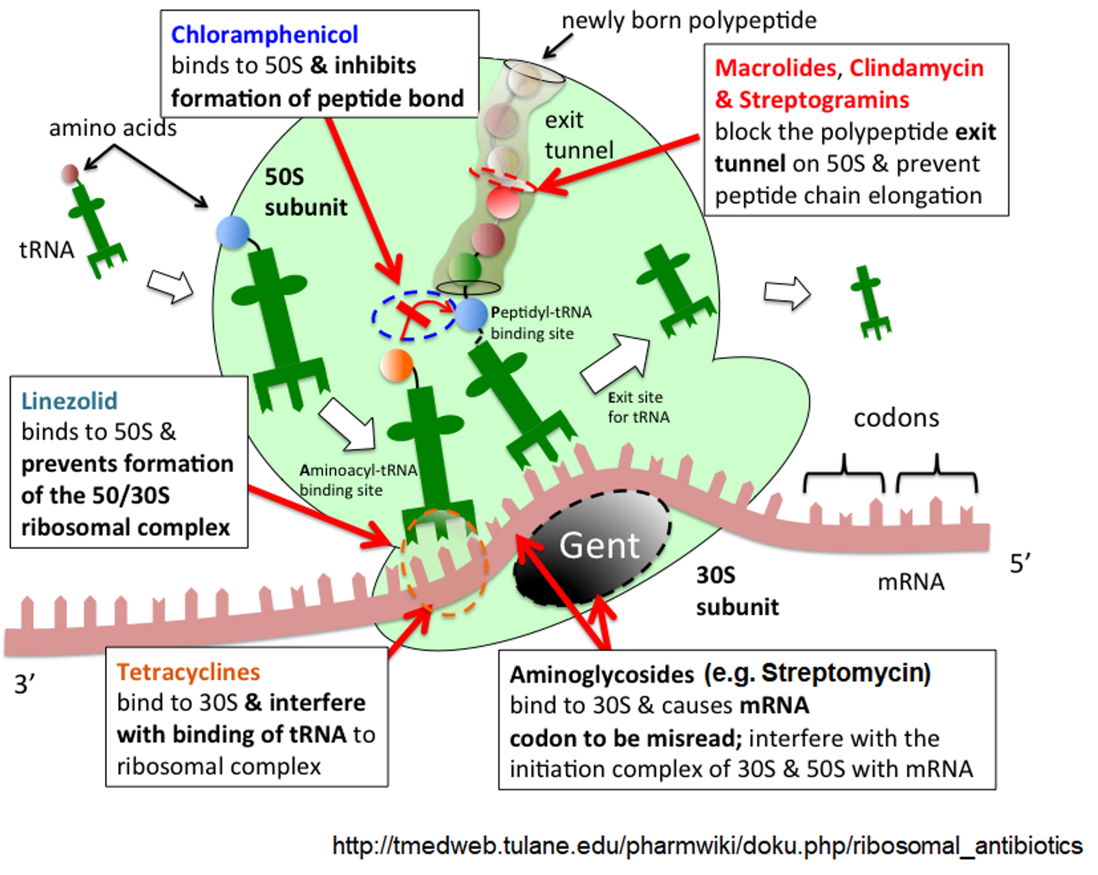 위 그림에 다양한 종류의 항생제가 나타나 있음. tetracycline의 경우 30S subunit에 binding한 후 tRNA와 ribosomal complex 간의 binding 자체를 block함. linezolid의 경우 50S subunit에 binding한 후 50S subunit과 30S subunit이 합쳐지는 것을 block함. chloramphenicol은 50S subunit에 binding한 후 peptide bond의 형성을 억제함. (즉, peptidyl transfer를 block함) macrolides, clindamycin, streptogramins는 50S의 exit tunnel을 block하여서 peptide chain이 exit tunnel을 빠져나가면서 자연스럽게 elongation되는 것을 block함. 마지막으로 Aminoglycosides(e.g. streptomycin)의 경우에는 30S subunit과 binding 후 mRNA codon이 잘못 읽히도록 해서 error rate를 높여 malfunctioning하는 protein이 생산되게 만들어줌.