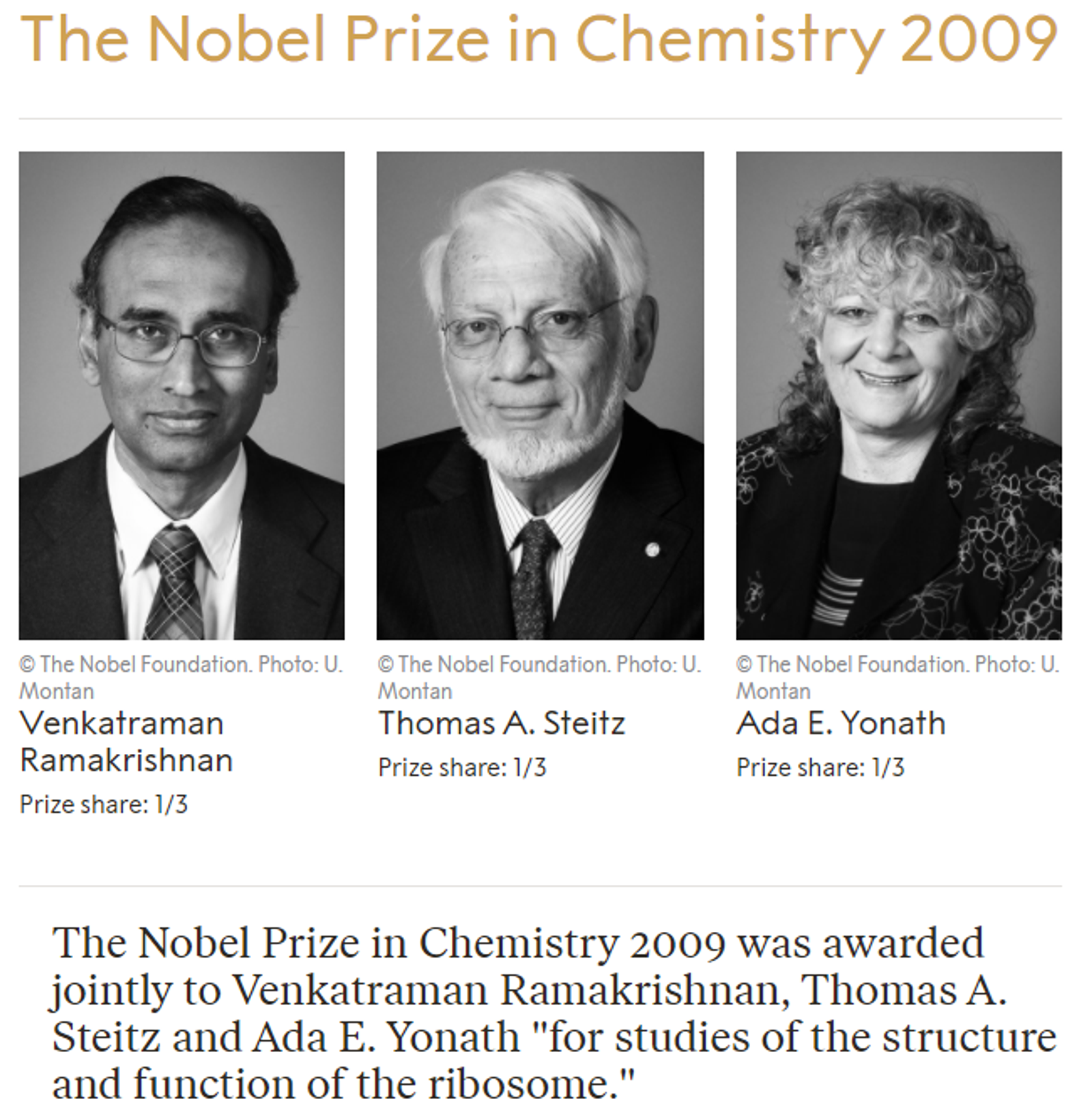 이런 공로로 2009년에 ribosome 구조를 밝힌 과학자들에게 노벨 화학상이 수여됨.