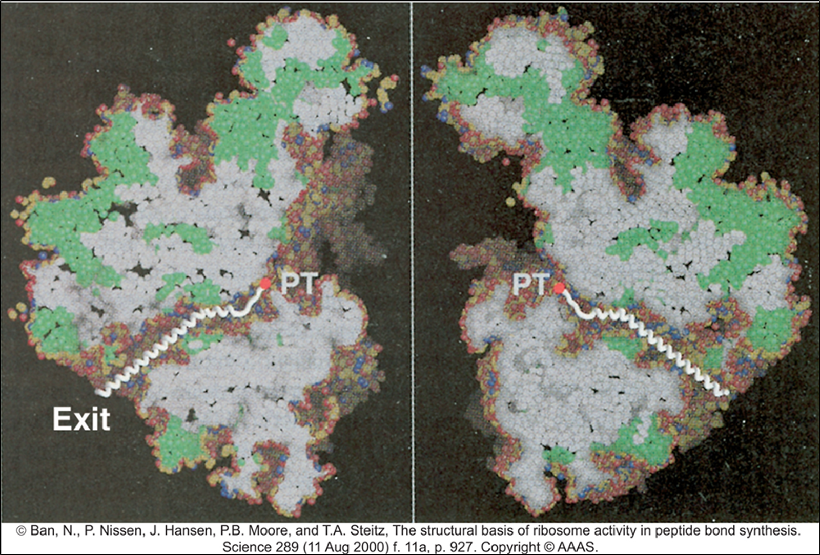 한편 E. coli의 50S subunit에는 exit tunnel이 있음. 이 exit tunnel은 점점 합성되며 길어져가는 peptide chain이 바깥쪽으로 빠져나올 수 있는 통로임. 이 통로의 폭은 평균적으로 15 옹스트롬 정도 되며 protein의 α-helix가 딱 fit하게 빠져나올 수 있을 정도의 넓이임.