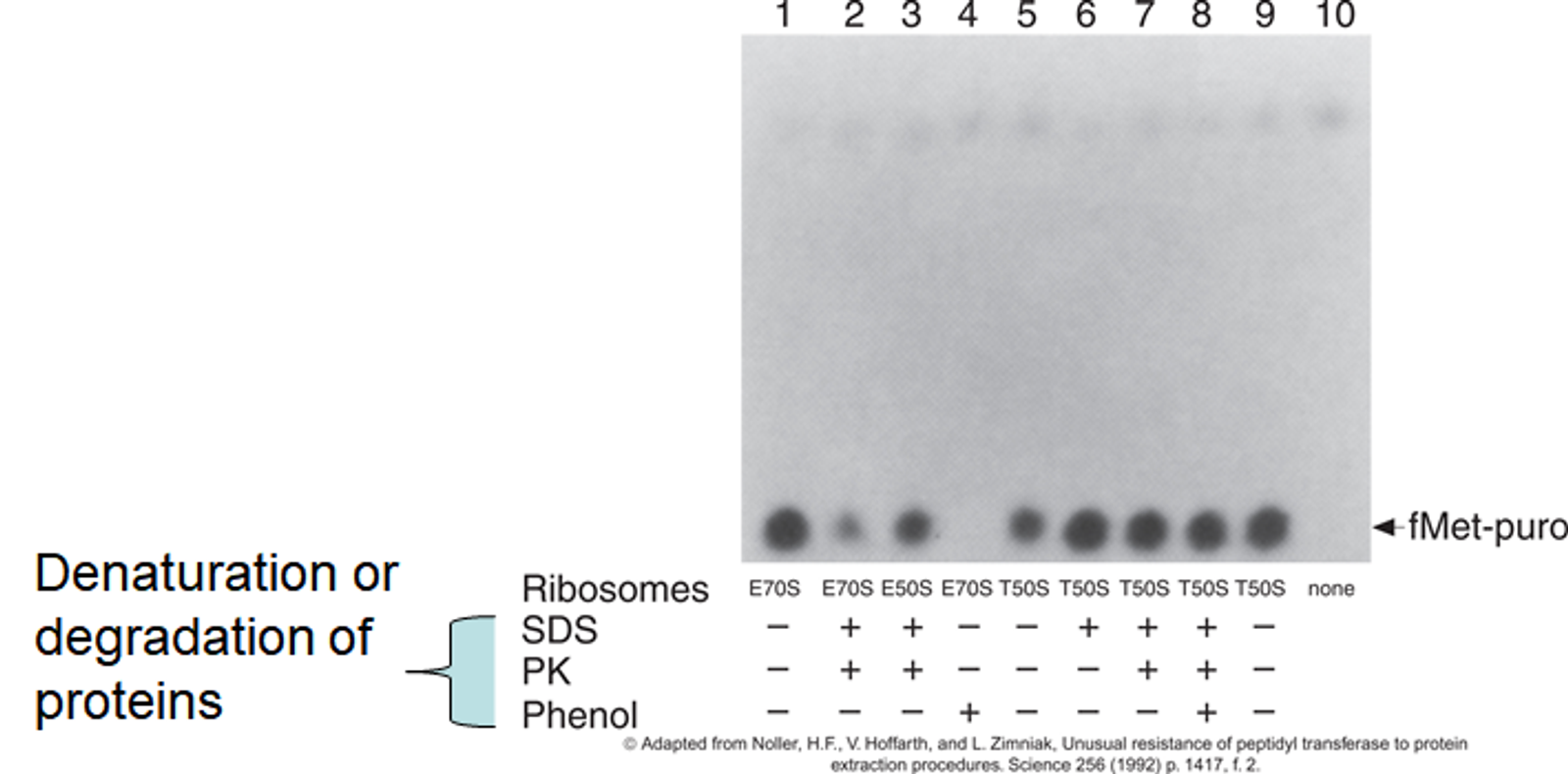 lane 2를 보면 실제로 E70S에 의한 활성이 SDS, PK에 의해 어느 정도 줄어들기는 했지만 그래도 일정 수준으로 유지되고 있음을 알 수 있음. 즉, 이를 통해 protein이 없더라도 RNA만으로 peptidyl transfer를 일으킬 수 있다는 것을 알 수 있음. 다만 lane 4를 보면 fMet-puro가 전혀 형성되지 않은 것을 볼 수 있는데, 이는 Phenol에 의해 RNA도 분해되어 버렸기 때문임.