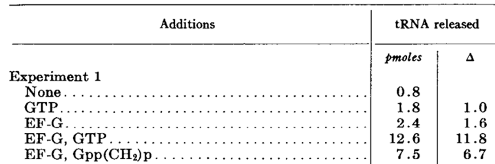이와 관련된 기본적인 실험 결과가 위 표에 제시되어 있음. 이 때는 여러 조합으로 factor들을 넣어주면서 tRNA가 release되는 정도가 어떻게 변하는지를 관찰함.