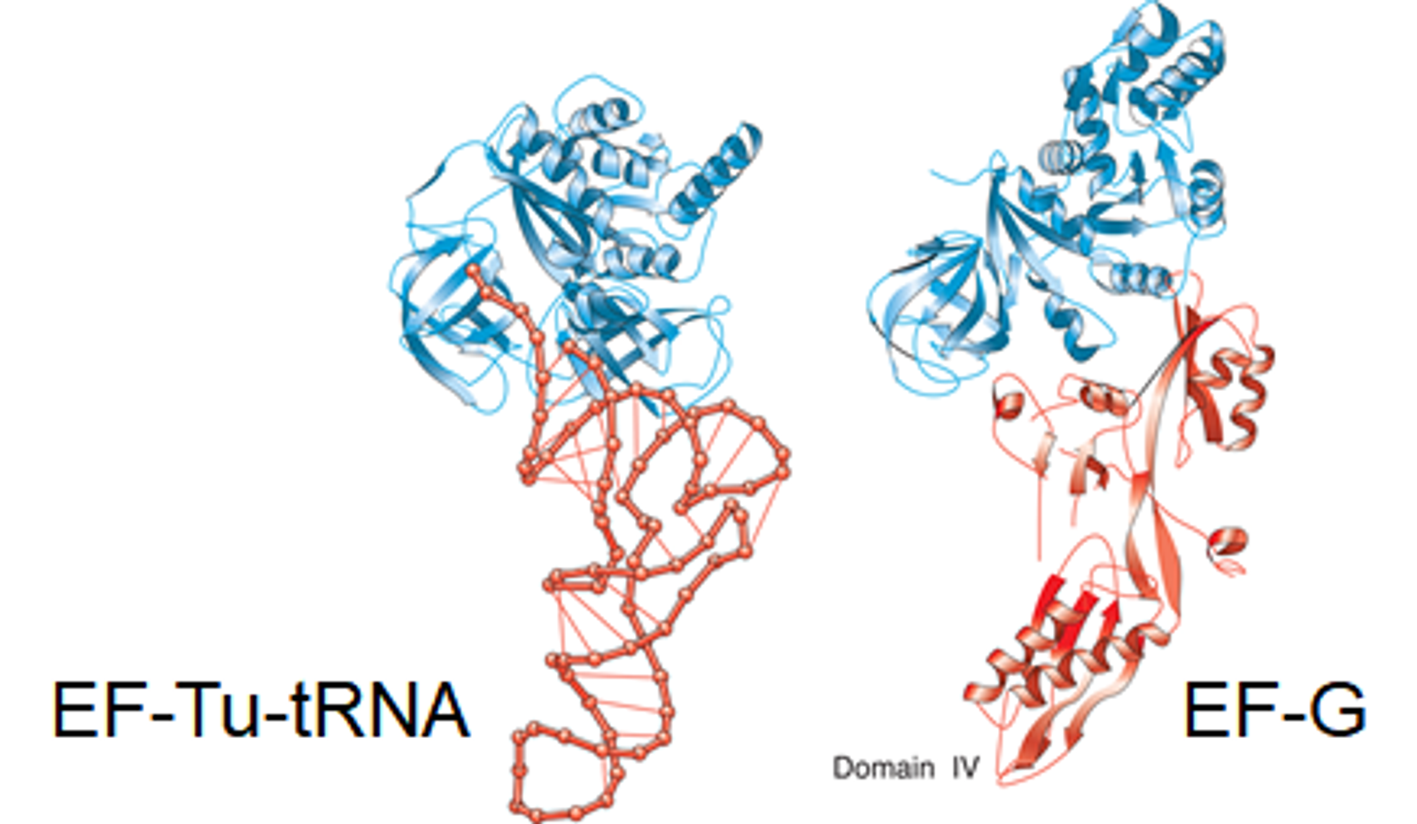 위 그림에 binding site의 유사성이 나타나 있음. 참고로 EF-G 같은 경우에는 앞서의 구조 그림에서도 나와 있듯이 내부에 tRNA와 매우 유사한 구조를 가지고 있어서 이 구조가 원래 tRNA가 붙는 A site와 잘 fitting된 채로 결합하게 됨.
