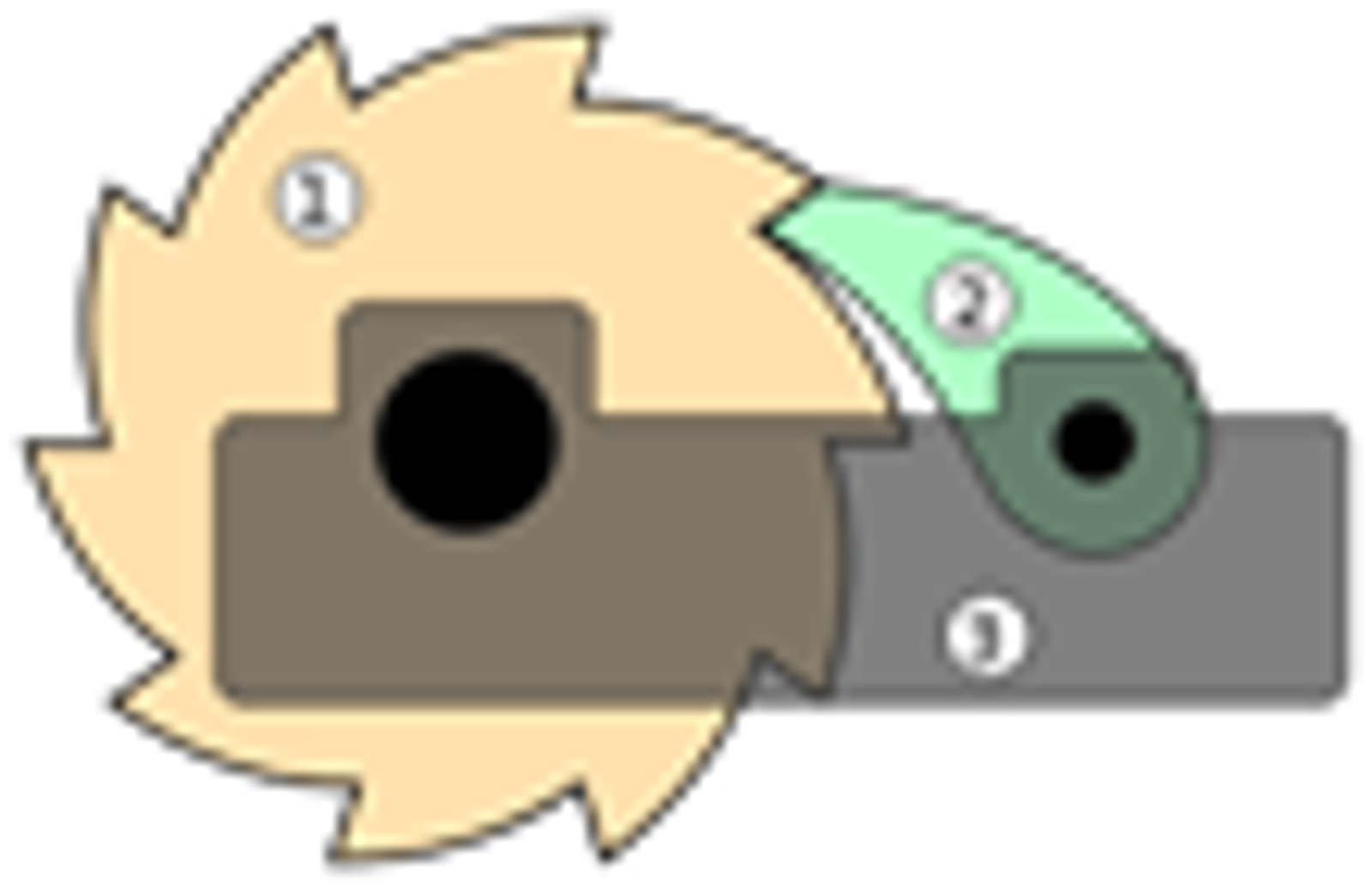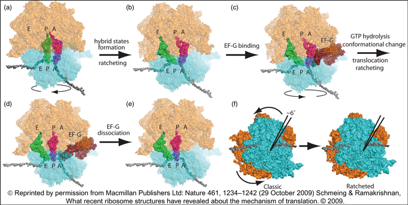 보면 우선 (a)에서와 같이 P, A site에 있는 amino acid들끼리 peptidyl transfer가 일어나고 나면 이후 P site에 있던 tRNA가 기울어서 large subunit의 E site 부근에 위치하게 되면서(다만 여전히 small subunit의 P site에 위치) P/E hybrid state로 돌입하게 됨. 한편 A site에 있던 tRNA도 마찬가지로 기울어서 A/P hybrid state로 돌입하게 됨. 이런 상태에서 EF-G가 들어오고 GTP hydrolysis가 일어나게 되면 EF-G에 의해 small subunit의 rotation이 일어나게 되고 그 결과 small subunit도 한칸씩 밀려 앞서의 tRNA들이 각각 완전한 E site, P site에 위치하게 됨. 이후 E site에 있는 tRNA는 release되면서 한 cycle이 마무리됨. 참고로 이 때 EF-G에 의한 rotation은 마치 아래 톱니바퀴 motion과 같음.
