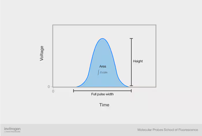 전압 펄스는 위 그림과 같이 세 가지 요소를 가지고 있어요. 펄스 높이(pulse height)는 수집된 빛의 최대 피크를 나타내고, 펄스 전체 폭(full pulse width)은 펄스 시작부터 끝까지의 시간이에요. 펄스 영역(pulse area)은 높이와 폭(시간)의 적분 값이에요. 이 세 가지 측정값은 각각 세포에 대한 다른 정보를 제공해요.