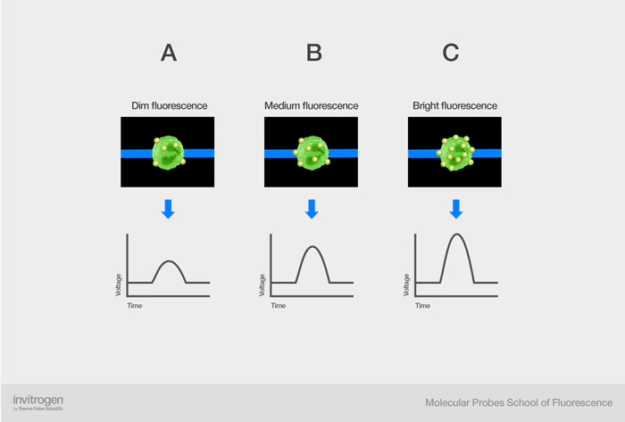 FSC와 SSC와 마찬가지로, 세포가 레이저 빔을 통과할 때 방출하는 형광은 전압 펄스를 생성해요. 세포와 결합된 형광체(플루오로크롬)에서 방출되는 형광의 양은 두 가지 요인에 따라 달라져요.