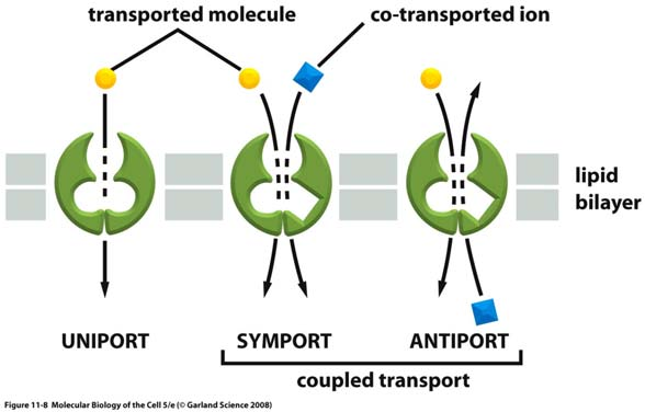 uniport는 오직 한 종류의 분자만이 transporter를 통해 이동하고 symport, antiport는 두 종류의 분자가 서로 coupling된 채로 transporter를 통해 이동해요.
