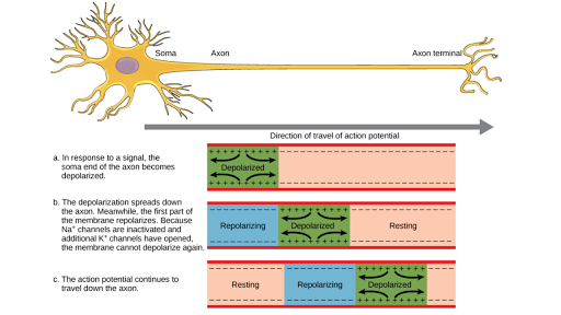 그 결과 이 활동전위가 위 그림과 같이 axon을 따라 전달되게 되면 말 그대로 신경세포를 통해 전기자극이 전달되어 다음 신경세포로 전파될 수 있게 되는거죠.