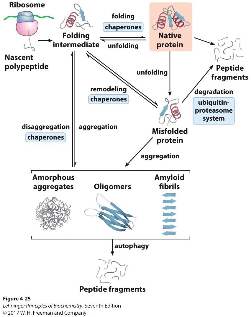 그러나 일부 misfolded protein들은 자기들끼리 aggregation되어서 amorphous aggregate(특정한 구조가 없이 그냥 뭉처진 형태), oligomer, amyloid fibril 등을 형성하기도 함. 이런 녀석들은 온갖 질병을 유발할 수 있음.