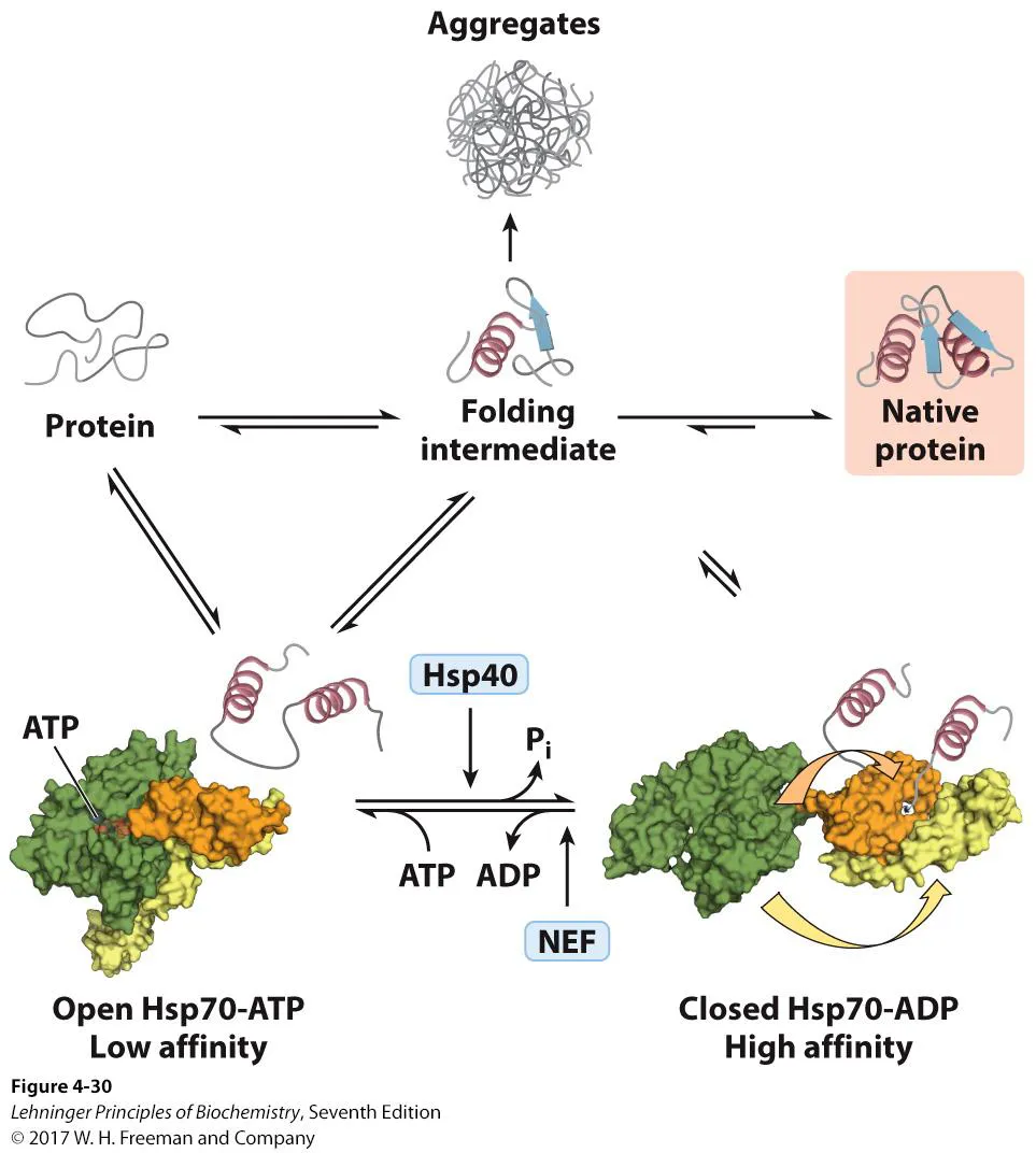 위 그림에는 Hsp70(질량이 70kDa)과 Hsp40에 의해 folding intermediate가 제대로 접히게 되는 과정이 나타나 있음.