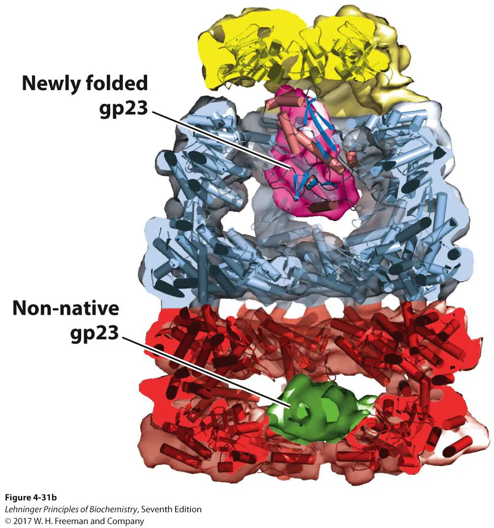 chaperonin의 구조는 위와 같으며 이는 Cryo-EM에 의해 결정됨. 보면 실제로 2개의 chamber가 존재하고 있음을 알 수 있음.