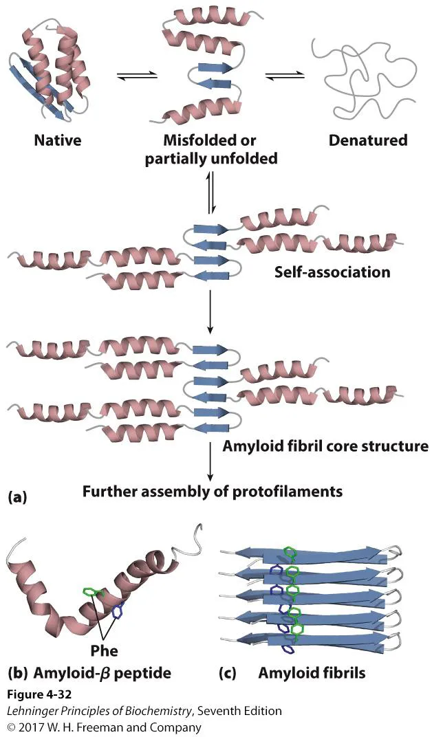 이런 식으로 형성되는 misfolded protein들이 모여서 만들어질 수 있는 대표적인 구조가 바로 위 그림 c에 나타나 있는 amyloid fibril임. 이 경우 β-strand끼리 잘 packing되어서 firbirl의 형태로 만들어지는 구조이며 이 fibril은 알츠파이머에서 관찰되는 대표적인 특징으로, 이 녀석에 의해 세포가 괴사하게 됨. (이 밖에 알츠하이머에서는 IDP의 일종인 tau protein들도 제대로 된 구조가 없다 보니 자기들끼리 aggregate된 결과 이상한 구조를 형성함)