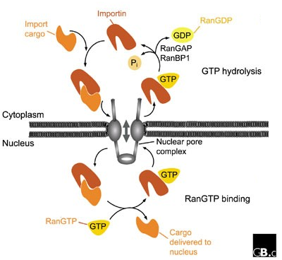 4) 핵 밖에 있는 Ran-GAP에 의해서 Ran-GTP가 Ran-GDP로 바뀌고 그 결과 Importin이 분리됨.