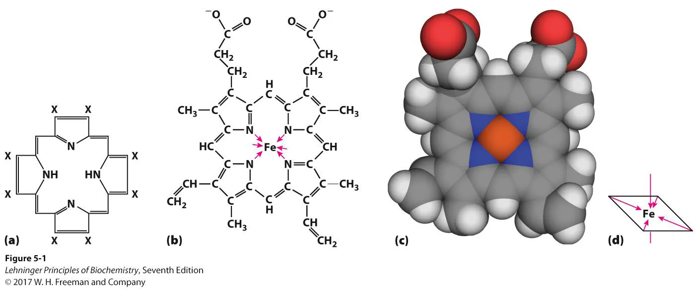 위 그림 a에 나온 것은 porphyrin ring의 구조이며, 이들의 중간에 metal, 그 중에서도 Fe가 자리하고 있는 b의 구조를 heme이라 부름. 특히 b에서 볼 수 있는 것과 같이 Fe는 porphyrine ring의 N과 총 4개의 coordination을 형성하고 있음.