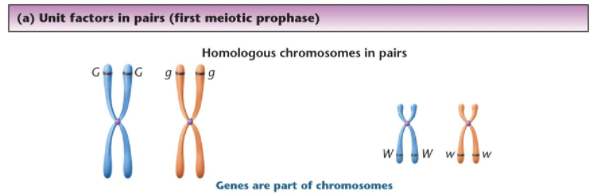 이는 위와 같이 1st meiotic prophase(감수 1분열 전기) 때 chromosome들이 서로 상동염색체 관계로 쌍을 이루는 것으로 설명 가능함. (chromosome이 쌍을 이루므로, chromosome 내에 포함되어 있는 gene 또한 쌍을 이룰것임)