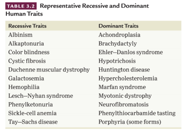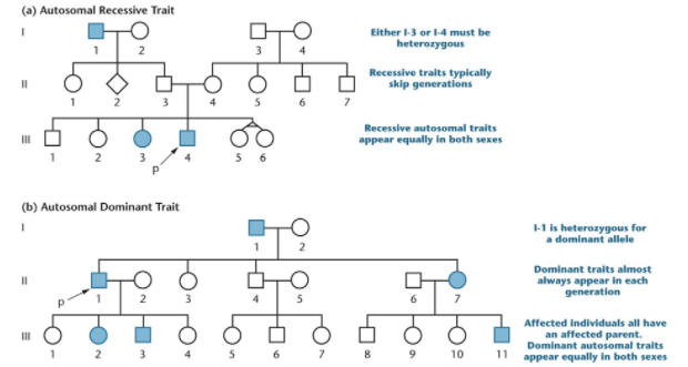 위 그림에는 autosomal recessive trait(상염색체 열성 형질)의 유전 양상과 autosomal dominant trait(상염색체 우성 형질)의 유전 양상이 나타나 있음. (이 때 autosome은 상염색체를 의미함) 보면 autosomal recessive trait의 경우 한 세대 걸러서 특정 trait가 발현되며, 발현자 중 남자 : 여자의 비율이 1:1이라는 것을 알 수 있음. 한편 autosomal dominant trait는 매 세대마다 특정 trait가 발현되며, 발현자 중 남자 : 여자의 비율은 여전히 1:1이라는 것을 알 수 있음.