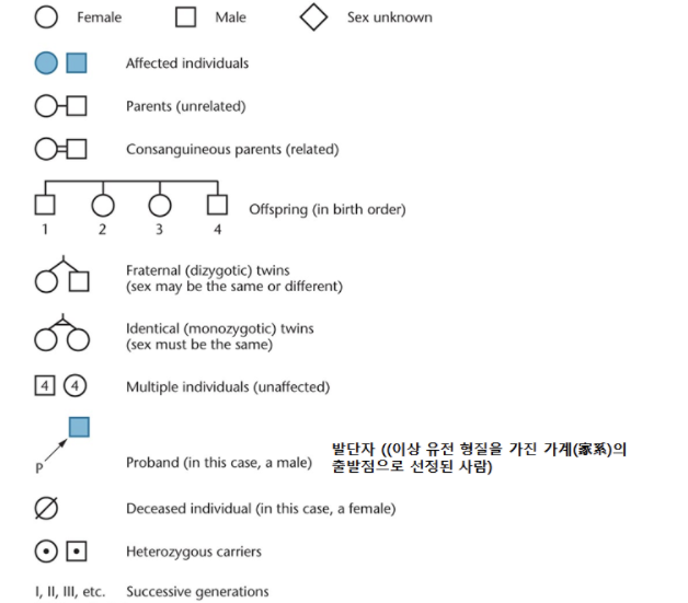 (참고로 이 때 fraternal(dizygotic) twins는 이란성 쌍둥이를 의미하고, identical(monozygotic) twins는 일란성 쌍둥이를 의미하며, proband는 발단자(이상 형질 가계의 출발점)를, heterozygous carrier는 보인자를, I, II, III 등의 표기법은 연속적인 generation을 의미함)