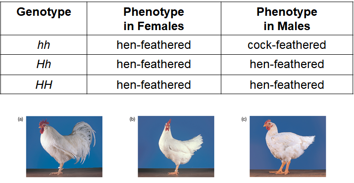 일단 암탉의 경우부터 먼저 살펴보자. 이 경우 hh, Hh, HH 모두 다 hen-feathered phenotype으로(위 그림 b) 나타남. 한편 수탉의 경우에는 Hh, HH일 경우 hen-feathered phenotype으로(위 그림 c) 나타나지만 hh일 경우 cock-feathered phenotype으로(위 그림 a) 나타남.