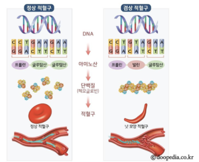 sickle cell anemia를 일으키는 mutation은 위와 같이 적혈구의 모양을 낫 모양으로 바꿔버림. 그 결과 육체적 피로, 통증, 뇌출혈, 폐/심장/신장의 기능장애 등이 발생함.