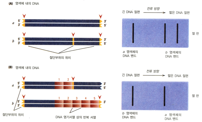 RFLP는 restriction fragment length polymorphisms의 약자임. 앞서 살펴본 것처럼 RFLP는 dominant gene과 recessive gene 중 하나만을 특이적으로 자르는 restriction enzyme을 이용해 DNA를 잘랐을 때 나타나는 polymorphism을 의미함.