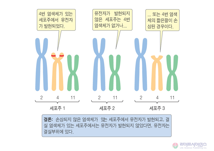 그 이후에는 밴딩기술(염색 등)을 이용해서 남아있는 염색체를 동정하게 됨. 이러한 동정 과정을 다양한 hybride cell에 대해 수행한 후 우리가 관심을 가지고 있는 특정 gene의 표현형을 특정한 뒤 관찰하게 됨.