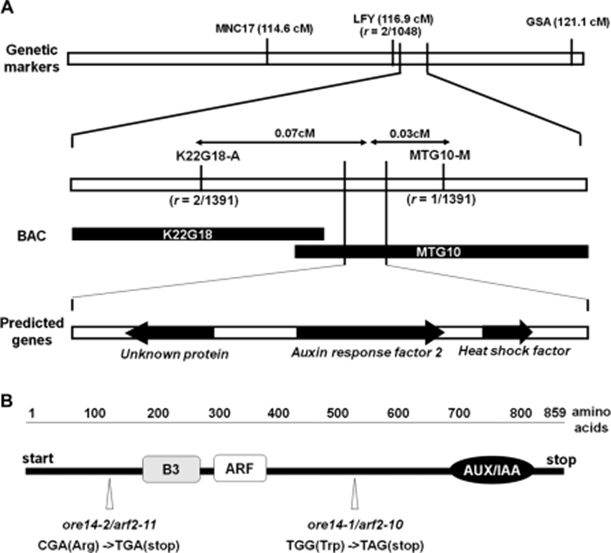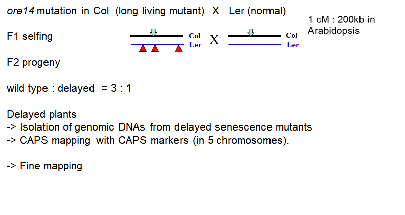 이 경우 col에 ore 14 mutation을 일으킨 개체(long living mutant)를 Ler(normal)과 교배함. (이 때 col이 열성) 그 결과 phenotypic ratio는 wild-type : delayed = 3 : 1이었음.