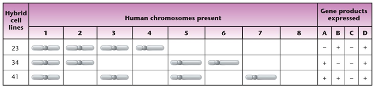 예를 들어 우리가 관심을 가지고 있는 gene이 D라고 해보자. 이 때 gene D의 expression이 관찰된 23, 34, 41의 hybrid cell line을 관찰한 결과가 위 표에 나타나 있음. 그런데 이 과정에서 모든 hybrid cell이 공통적으로 가지고 있는 chromosome은 1번 하나뿐임. 결과적으로 chromosome 1에 gene D가 있다는 것을 추측할 수 있음.