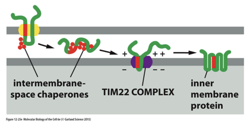 마지막으로 위 그림처럼 TIM22라는 녀석에 의해서, 아예 처음 단백질이 수송될 때부터 곧바로 미토콘드리아 내막에 단백질을 전달해주는 방식도 존재해요.