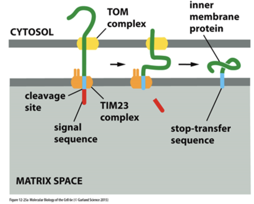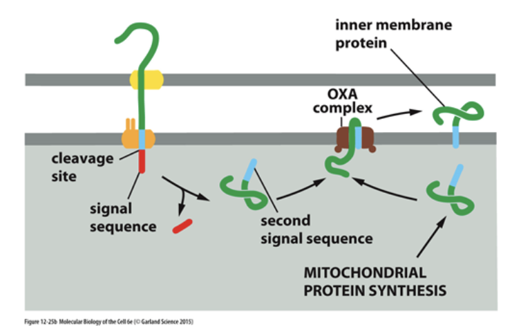 자세히 살펴보면, 일단 단백질이 TIM-TOM complex에 의해 미토콘드리아 내부로 수송된 다음에, signal sequence 하나가 절단되며 노출된 second signal sequence가 미토콘드리아 내막의 OXA complex라는 단백질 복합체에 인식돼요. 결국 이 단백질은 미토콘드리아 내막에 박힌 형태로 존재할 수 있어요.